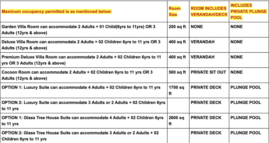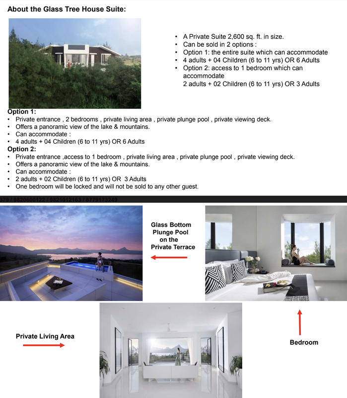 | GLASS TREE HOUSE SUITE (1 BEDROOMS) | AP – ALL MEALS | 24000 | 25000 | 7000 | 4000 | 1 |