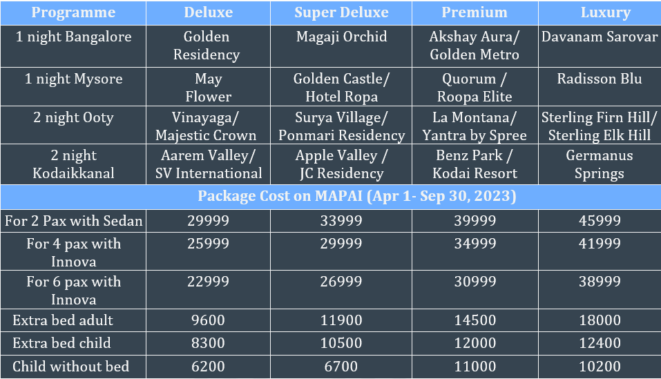 This package includes the location: BANGALORE, MYSORE, OOTY, KODAIKANAL.